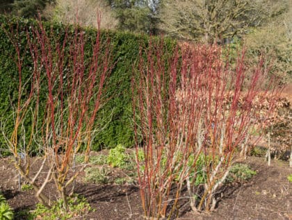This hedge is suitable for all year round a has various characteristics that will bring added interest to your garden. In order to get the best from your hedge and gain those unique colours the plant is famous for pruning is essential. It has a quick growth rate of and can reach 24 inches a year so don’t worry about cutting too much. The best time to prune a dogwood hedge is when the hedge is dormant during the winter or early spring before new leaves appear. It is recommended that you cut you cut the hedge back around 2 – 4 inches above ground level. This will produce a more colourful bark in Winter.